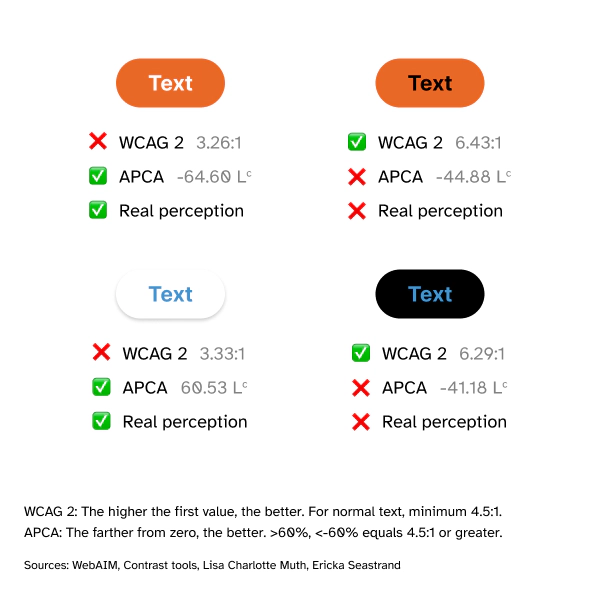 이러한 한계를 극복하기 위해 APCA 색상 대비(Advanced Perceptual Contrast Algorithm)가 제안되었다. APCA는 인간의 실제 색상 인지 방식을 기반으로 하여, 주황색과 같이 특수한 색상에서도 더 정확한 가독성 예측이 가능하다.