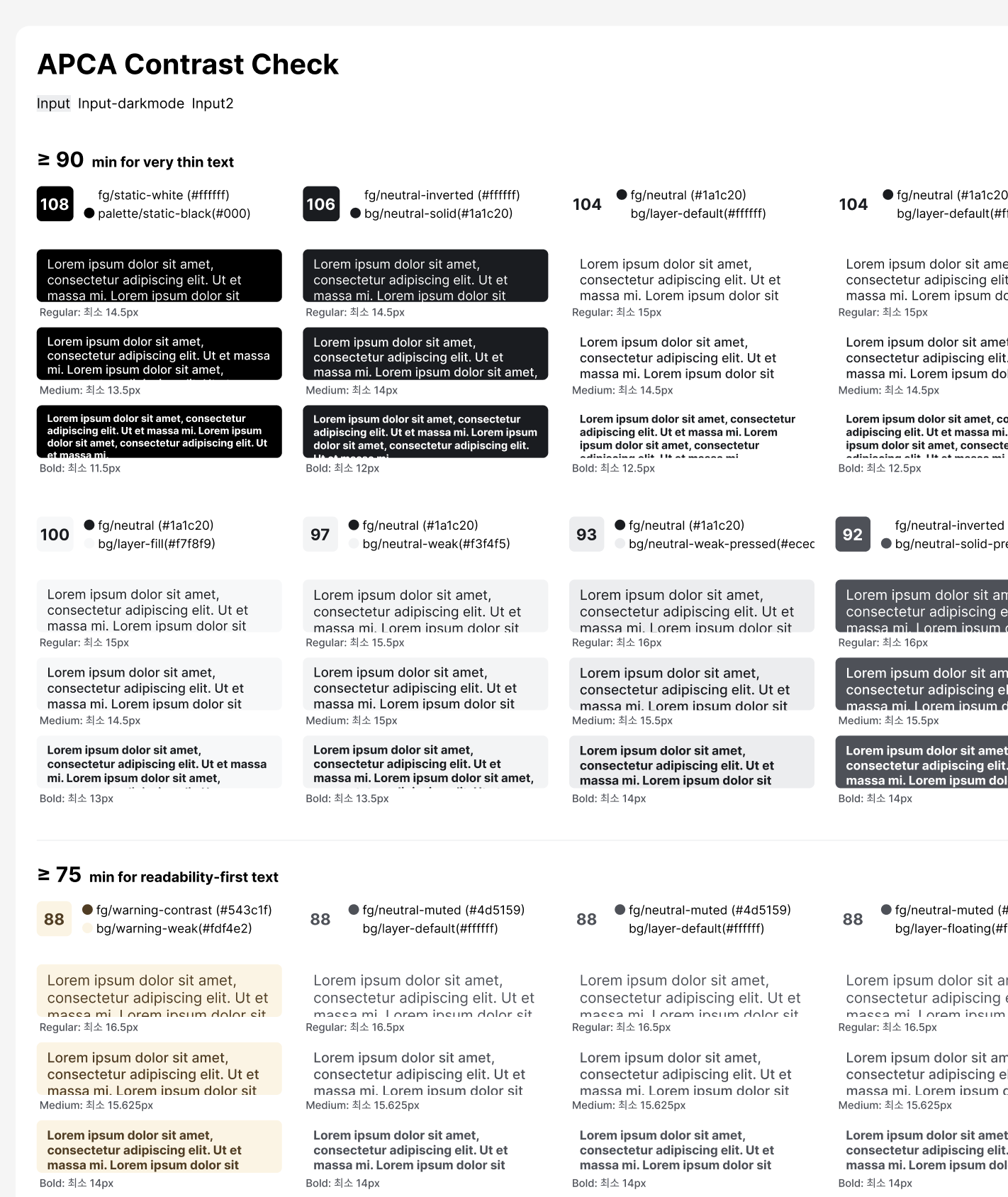 Figma 위젯은 WCAG(Web Content Accessibility Guidelines)나 APCA 색상 대비와 같은 접근성 표준을 기반으로 색상 대비를 평가한다. 위젯은 배경색과 전경색 간의 대비율을 자동으로 계산하여 디자이너와 개발자에게 즉각적인 피드백을 제공한다. 특히 APCA를 활용할 경우, 글꼴 크기, 두께, 색상의 특성을 고려한 더 정확한 가독성 평가가 가능하다.
